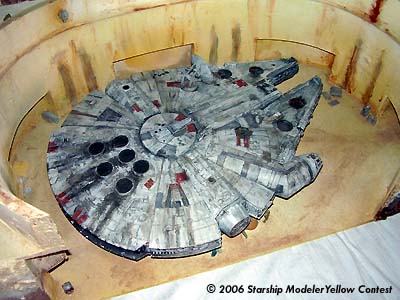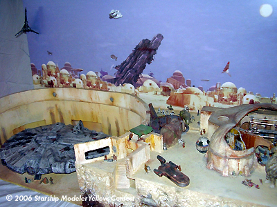 The diorama features the following model kits and toys: MPC Millennium Falcon (modified from stock kit). Cantina Model kit x2 (modified from stock kit). Micro Machines Luke's Landspeeder, Lars Landspeeder x2, Ronto, swoop, many left over greeblies from various model kits (X-Wing, tie fighters, B-wings , etc.)