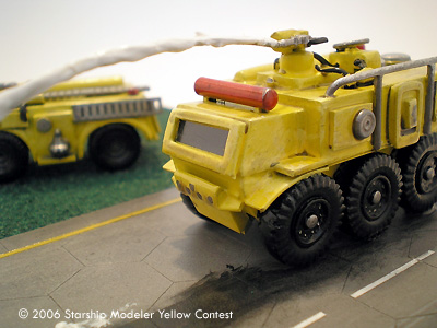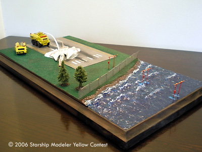 The principal tie to the theme are the yellow crash rescue appliances. The appliances are scratch built with the wheels coming from a 1/72 truck, just right for a fire truck. The crashed plane is a 1:144 Lee F-20 tigershark modified to look like technology 50 years from now, heavily influenced by the new BSG. The wings are scratch built and an extra pair of engines are mounted. The runway is hand scored styrene, the grass is painted sand and the water build up slowly with layers of Liquitex gloss gel medium and blue pigments. This was also used for the fire fighting foam, but with white paint. The trees are railway scenery but the fence is scratch built from wire and fine wire mesh.