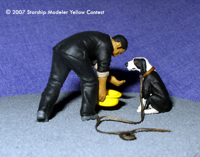 In this vignette, inspired by scenes from the Battlestar Galactica third season premiere, Felix Gaeta offers water to a dog in a bright yellow bowl. Following the Cylon occupation of New Caprica, Gaeta-a Baltar administration insider-leaked secret Cylon plans to the resistance, led by Col. Tigh and Chief Tyrol. The position of the yellow dog bowl was the signal Tyrol used to communicate with his anonymous source.