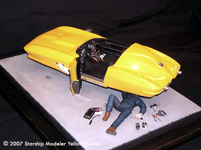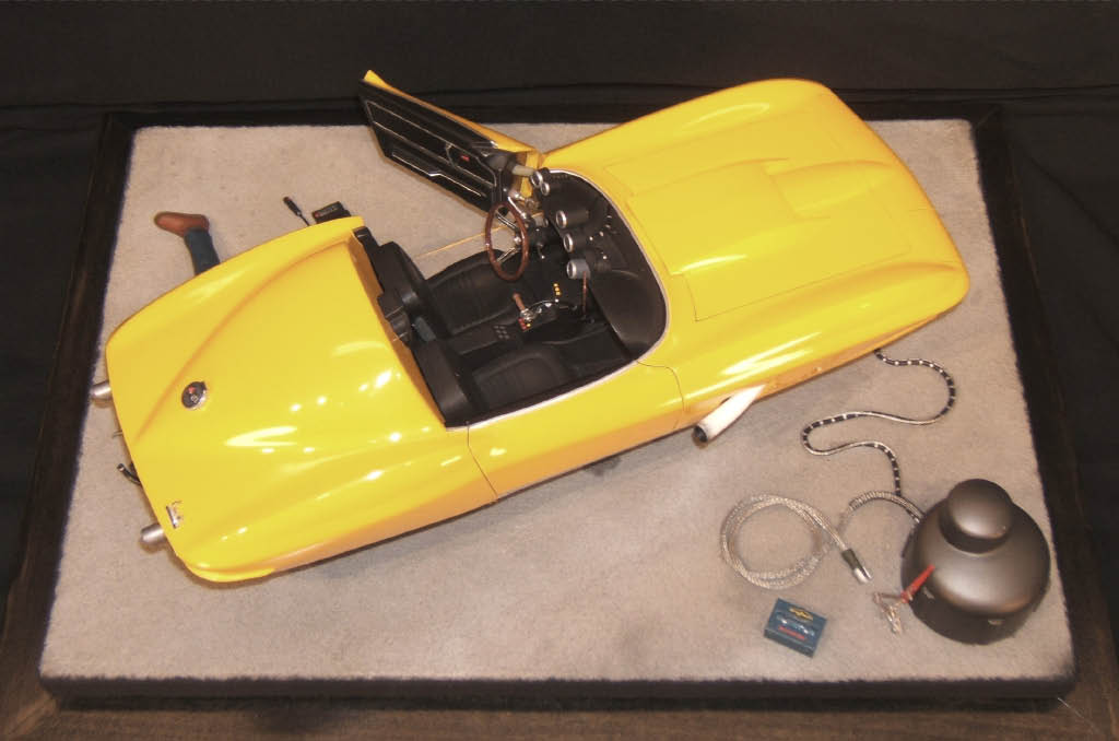 This model started life as a 1/12 scale Monogram 1967 Corvette split window bought at Wal Mart. I knew what I wanted to do with it so I started sketching ideas for the diorama and the specific systems on the car. I kept flashing on a vision of the dashboard bristling with analog gauges and wires, so that was where I started. To get the best view of my “dream dash” I knew the roof would have to go, but I LOVE the teardrop back of the '67' so as a design feature I knew that had to stay…so off went the windshield (field generators keep you safe!), the roof, and the rear windows got filled in. I decided to open a door so the viewer could see in and get a feel for what it would be like to be at the controls.