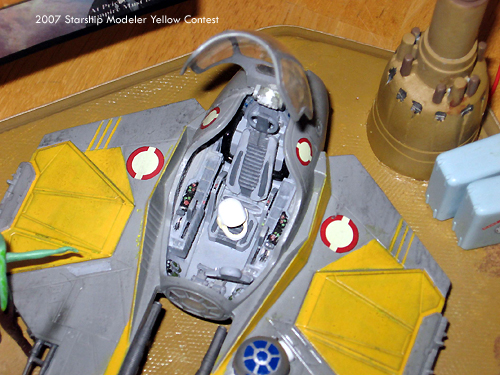 The model is an AMT/ERTL Jedi Starfighter, made to represent Anakin Skywalker’s yellow starfighter. A scratchbuilt targeting computer uses a picture of the device shrunk down and glued to the plastic. The landing gear was a mix of gear from a SW snowspeeder (front legs) and a ST Romulan Scorpion model (back leg). The Twi’lek “Vanna White” is a modified swimsuit figure from a 1/24 scale car accessory kit. She sports an outfit made from aluminum foil. The Imperial Auction sign was constructed from the exhaust nozzle of a 1/32 scale F-16 and a STAP laser barrel. The auction advertisement (which came out rather poorly in the photos) was made from pictures found on the Internet. The bombs were extra ammunition generously provided from the same 1/32 scale F-16 model.