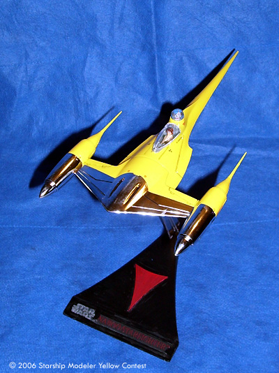 This is the Naboo N-1 starfighter. This is also my son Jared's very FIRST model kit (he is 10). It was a snap kit that we had laying around for many years in his closet. Star Wars Episode One was the very first Star Wars movie he ever saw, and then watched them in chronological order. It was his favorite until he got hooked on the "Clone Armies". I guess the rest of us were very cynical of the film, but to him, a 9 year old hero was VERY cool!