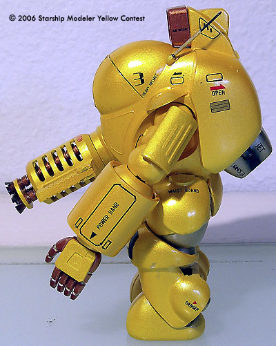 This is Gunze-Sangyo's Machine Soldier Dorvack PAC-48G Doldian . It was built long ago and far away when my wife asked me why I always paint everything so beat up. So, I painted a bright yellow one.