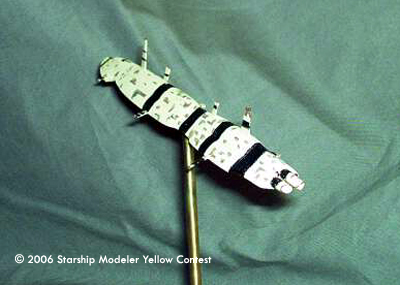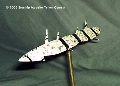 Once I had the shape, some very careful sanding knocked down the sharp edges, and a single large gun port was added to the nose. Three short styrene tubes were used as engine tubes, and all the fins were cut from thin sheet styrene. Yellow paint made a close match to the ship in the painting, and then flat black acrylic paint made up the striping. The hull panel detail came from a Prismacolor Gray marker.