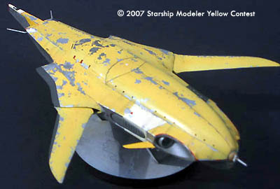 The model is 1/72 scale, and measures 225 mm (9 in) in length. It's a compete scratchbuild; the flat surfaces are sheet styrene, and the curved pieces were made with balsa forms, then cast in polyester resin. It's a variable geometry model--the wings are geared together and swing through about ten degrees. I've ripped the paint up pretty good: a few hypersonic reentries will do quite a number on the finish.