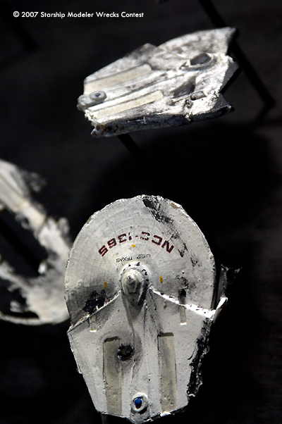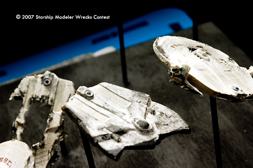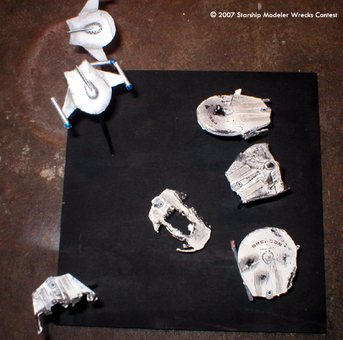 This convoy attack was put together with two Romulan Bird of Prey kits from RBM Models and some very poor mis-cast Miranda class hulls. The Romulans were given a non-traditional paint job to try and give them a slightly updated appearance. The Mirandas were all painted a very light grey and decaled before being heavily weathered and given a black wash. I then cut a number of 'hobby sticks' to various lengths to give the display a three dimensional element and embeded them in a wooden base. Then, I painted the whole base assembly black before mounting the ships on them.