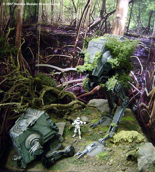 The primer is the "traditional" Chaos Black from GW , useful also on plastic not only for game miniatures, and the colors are Vallejo acrylics with oils for the weathering. The diorama was made with chalk, rocks, lichens, flock, little pieces of a real tree as well as drybrushed, dust and pigments on the surface and cardboard all around. The "head" of the wrecked mecha on the ground has been damaged and battered to show a partially burnt remnant of an AT- ST destroyed by the Ewoks who - in brief time - discovered how to attack such a powerful machine using natural weapons like enormous trunks of the forest, stones, fire and so on...everyone knows how the story ended and the Empire was finally defeated!"