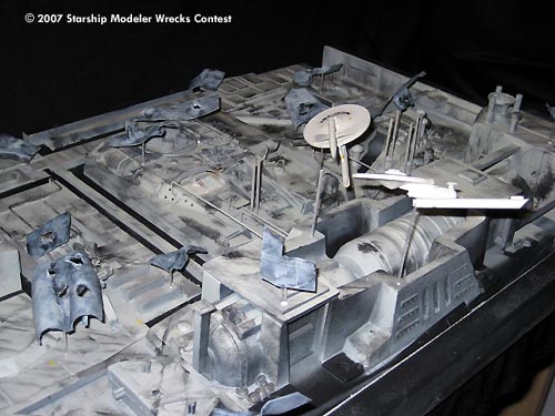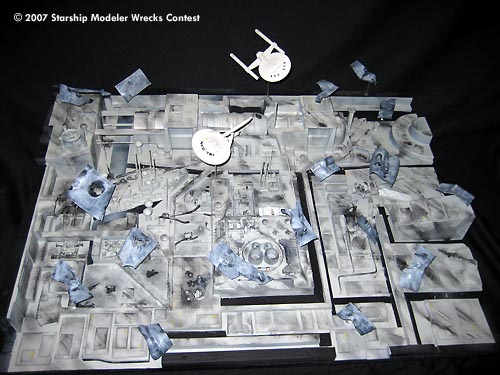 The diorama is a 24x18 piece, constructed of plywood, basswood strip, brass and styrene stock, and kitbashed plastic model parts.