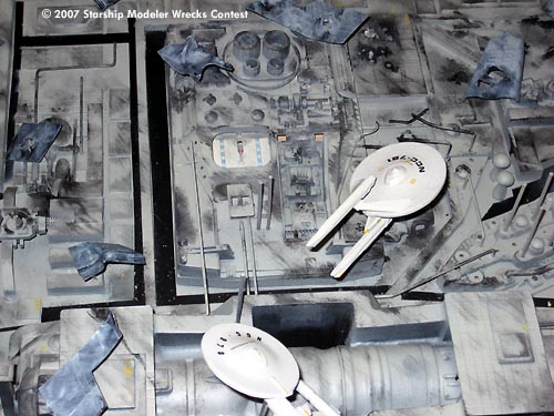 As they neared the surface, the destroyers approached one of the larger trenches, which had grown to the size of massive rivers running between contents of heavy armour on the station's surface. Little light escaped the surface, and the spotlights from the Federation ships cast an eerie glow on the wreckage below. The ships slipped in amid the orbiting debris field…