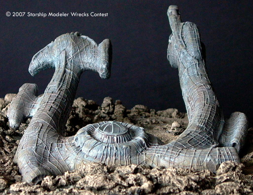 In the movie, the derelict was simply still laying there in the landscape. So what happened? My imagination was an accident, made from this crazy alien in the chest of the dying pilot. So it must be an impact... Or isn't it? (And of course the planet lv-426 is not the home world of those terrible beasts.) So I put the body of the ship as if it had rammed down on the planet's surface, with the front of the derelict filled up with heavy rocks.