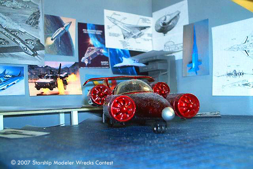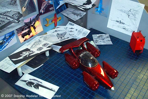 I took a M400 Die Cast Model that I'd ordered from Moller International, and set it into a garage that had been previously built. I then took many, many aviation, video game, and aerospace images that I'd gathered over time and started printing them out, usually in a business card size format. These were carefully sorted for impracticality or sheer nonsensical value, such as the NASA recruiting poster, the Bel Geddes Airliner, or the Corgi Toys Junior E2009 James Bond Aerocar from1977. They were carefully strewn around the diorama, and then for the final touch, some clean laundry lint was shaken over the Skycar to simulate scale dust.