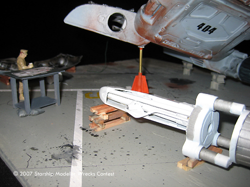 I chopped off the side cannon spars and patched the holes from these guns and the turret mount with sheet styrene in order to smooth the lines. I added a set of engines, cockpit ladder, and some greeblies, and then proceeded to putty, sand and paint. I deliberately kept the fitup on the forward thruster cowlings rough because with all the exposed rivet heads, it seemed to fit better.