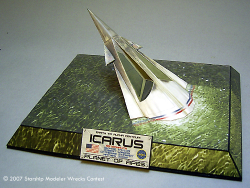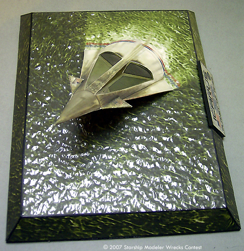 The water surface is made from “seafilm”, the part where the ship is sinking has been cut away so that it really sits inside of the waves. You can see the underwater-section of the ship when looking to the base at the correct angle. added the ongoing red and blue stripes on the hull and the small wings to that texture. It really looks like you are able to see into the water of the display base! Oh, and if you wonder whythe water is green and not blue: because it looks that way in the movie (a dirty little lake, not a sunny beach...).