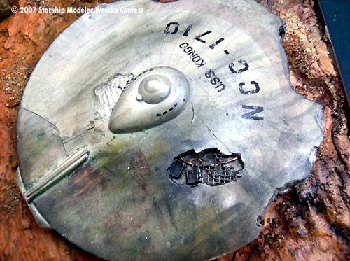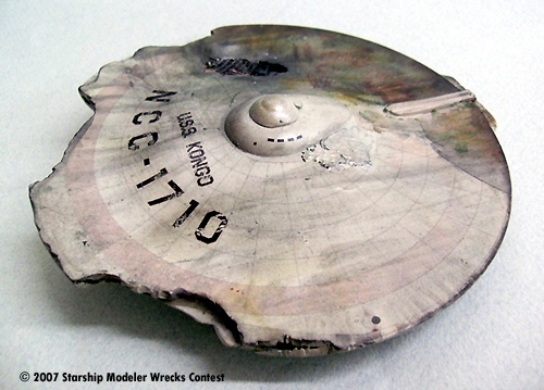 The saucer is from Polar Lights 1/1000 Enterprise Kit. I built the saucer pretty much stock, then cut up the front with a razor saw. I painted the hull Testors camouflage grey.