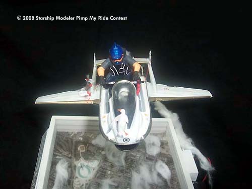 We are in 2012 and we just discovered antigravity. Finally I had what I need to complete my crazy project of flying above the clouds. I bought an old water racer and attached a pair of wings to it. For the propulsion I attached a jet engine under the belly. The antigravity is in the front to give the extra lift capacity. Everything went well on my first flight. Unfortunately I hit a couple of seagulls and I had to use my parachute to return to earth...