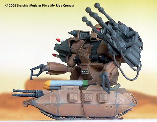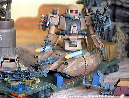Zaku MS-06 is perfect for desert-like landscapes. Usually the Zaku tank is a worker unit, but it's also possible to wear a lot of heavy arms! This hybrid Tank-MS is upgraded with new armor pipes,90mm Rapid-Fire Anti Air Machinegun x2, 120mm Machine Cannon x 3, Anti-MS Torpedos x 2, Anti-Air Missiles x4, Plasma-Impulse Flak x 4