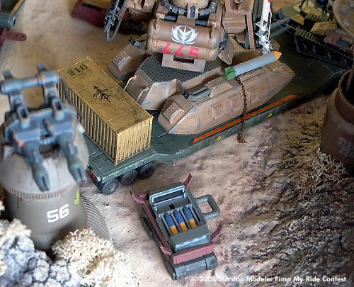 The Landscape and the Rocks are molded from Polystyrol-Foam and plaster on a wooden plate. The desert base itself is made from scratch, with parts taken from different kits and plastic bottles, upgrade units for model train stuff and some Option Kits from Kotobukiya.