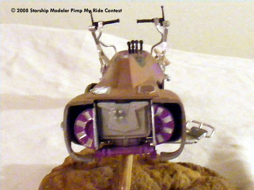 I started this kit a few years ago and shelved it because I just couldn't get any good ideas for it and I ended up losing interest in the model. I wasn't planing on using it for this contest, however while me and my son where watching the animated Clone Wars I suddenly was struck with inspiration. I modeled it after Obi wan's speeder bike. When I took it down and looked through the parts I noticed a few key pieces where missing, including the rider and part of the steering vanes and the instructions. Assembly was pretty much straightforward. I changed out the power engine lines with wire mesh and custom designed the steering vanes. I chose "Caribbean Sunset" for the main paint and purple for the accent color.