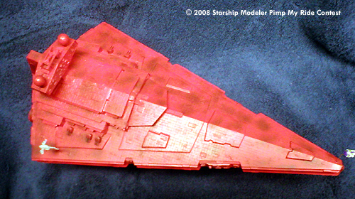 The Errant Venture was built as a mostly OOB Star Destroyer kit. A few slight modifications were made, most notably the addition of some guns cannibalized from a 1/700 New Jersey battleship kit and a bit of putty to fill in the most obvious gaps. She was then given a coating of bright red, but it still didn't look quite right to me. At almost every time I've read about the Venture, the ship is half falling apart, so I went ahead and weathered her up a bit. Even dirty, she is still one pimped up ride.