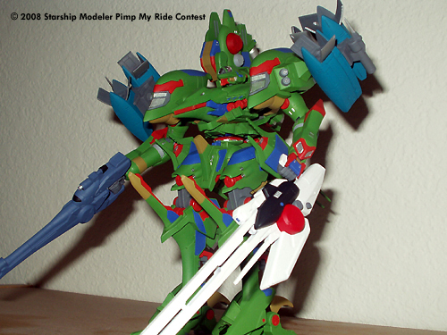 Comus has the more reserved color scheme: most of the machine is black with red details and white head and hands. I wanted the machine to suggest a grim reaper theme. Comus' weapons are painted in dull metallic shades.