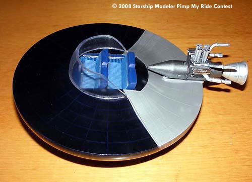 The model itself is built from the saucer section of an old AMT Enterprise I scrounged up on eBay. It was badly built, and had about a millimetre of cheap white spray paint on it... I was trying to find a recognisable UFO kit to pimp, but had to settle on this arrangement when I couldn't find any. I cut away the bridge bulge and fitted the interior from a '57 ford (suitably modified with tuck 'n' roll upholstery of course!), and cut holes in the bottom for the lifting drives - four gold plated Volkswagen hubcaps (You can't pimp a ride without fitting rims!). The engine involves bits of modified '57 ford V8, shuttle booster rockets, engine bell from an Apollo CM toy and various other things I scrounged up. The windscreen started life as a dome, and would have stayed that way except I decided it was easier to cut it down into a roadster screen than to remove the injection point on top...