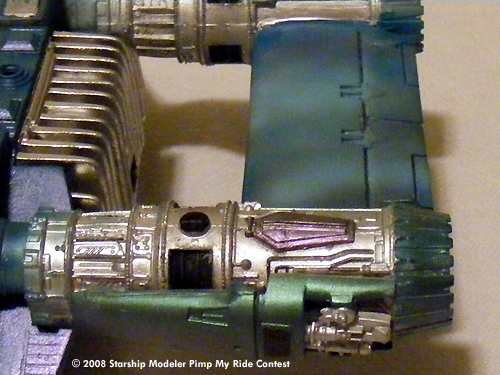 I used a pair of engines from the Ankin pod racer. I set it up with a sound system for the young man using Aves putty and the seat and controls from a sea quest salvage using custom color paints I set up a "hip" cammo paint job. I cut out the stencils by hand using grid paper to design the pattern.