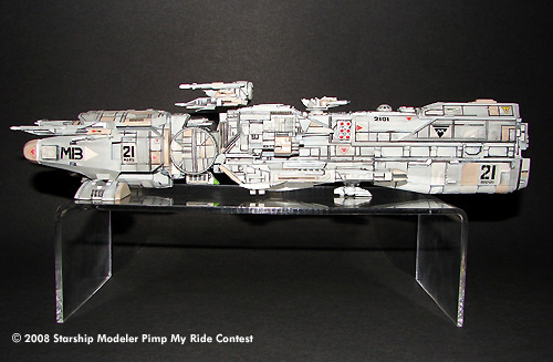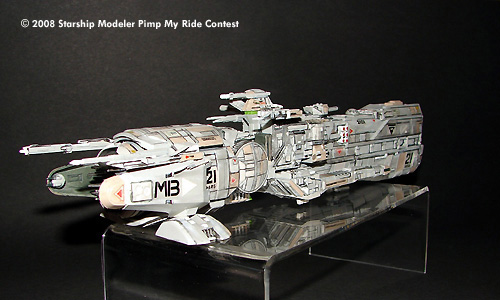 The ship is inspired by Robotech and the ship designs particularly in the third instalment “The New Generation” (Mospeada). This ship is built around a Sulaco model hull, flipped upside down and I have added some custom parts form other kits to form the bridge and comms dome. The model itself measures about 40cm in length. I tried to make the bridge resemble the SDF-1 but on a much smaller ship scale.