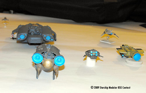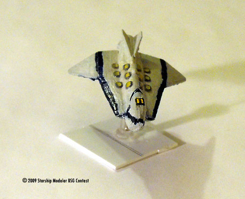 Made using a small SAAB Draken model, some lifeboats and rafts from a battleship, and missile fins, this was an easy and fun bash into a smaller and lighter transport vessel than the famous Colonial Heavy 798 (soon to be Colonial One)