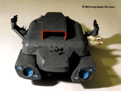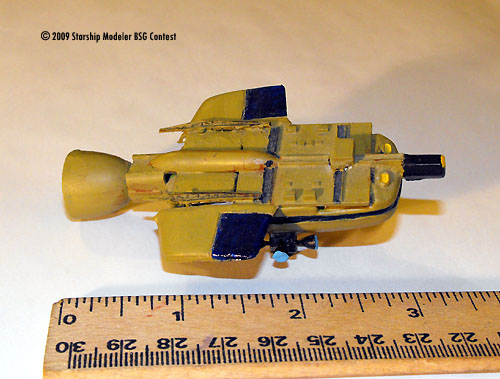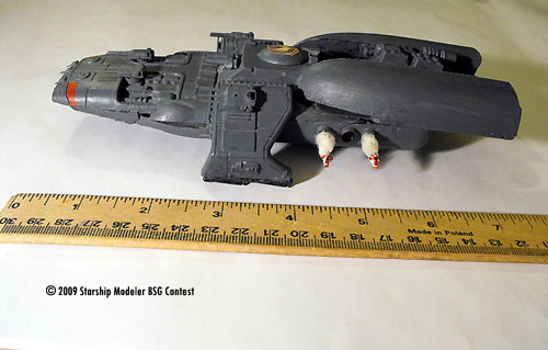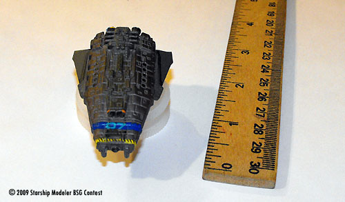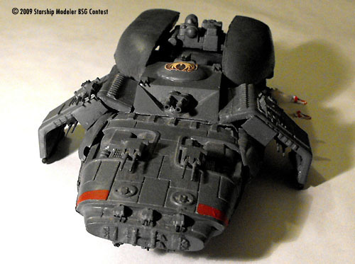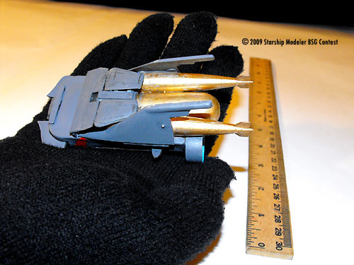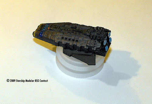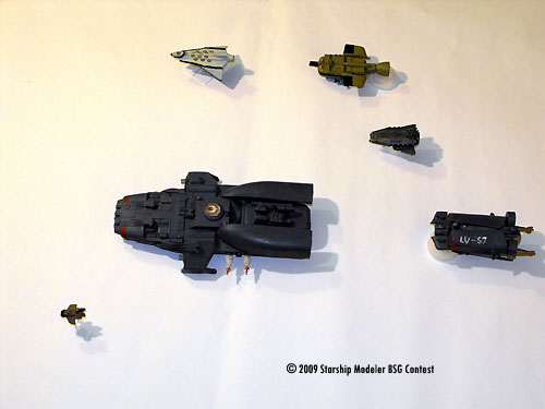 The bow of the ship and extending wings are from a Star Trek Runabout Science Pod, (actually the initial inspiration for the build, I thought it looked Battlestar-y.) The central hull is comprised of a dme light from a car, and parts of a Lunar Lander module. The engines are parts of a Russian submarine hull, and in between the engines are a post-it note holder, and the backpack of a stormtrooper action figure. The ventral hangar bay is part of a battleship hull. Various rockets and ship turrets also included.
