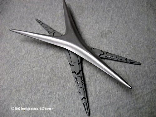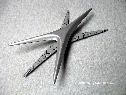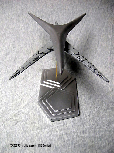 I really liked the design of the Cylon Basestar from the new Galactica. When I bought my Galactica I also bought Replicas Unlimited Cylon Basestar. Both kits are in the same scale. If not the easiest this is certainly one of the easiest kits to build. The kit consists of two identical "stars" that are glued together 90 degrees from one another. I filled the seam around the circular hub and that was it. I painted the top and bottom and the base with Alclad II Aluminum. The insides were painted with Aircraft Gray. The model was gloss coated and the insides were washed with an oil wash. This was a very simple project that looks good on the shelf with the Galactica.