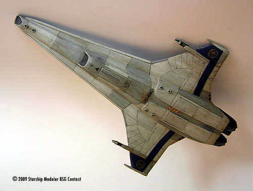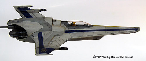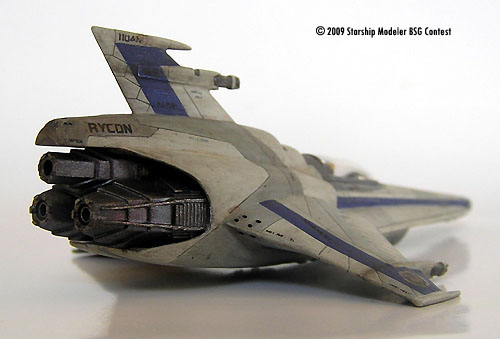 As you can see I don't care for series continuity or screen accuracy as I used decals as I liked, representing a ship from the Battlestar Rycon (I liked the name) bearing markings from the Galactica (I liked the design), but hey, it's science fiction - everything is possible. The paint design is my own and I added a lot of "inscriptions" from a 1:72 Verlinden aircraft transfer sheet to give it a more realistic look.