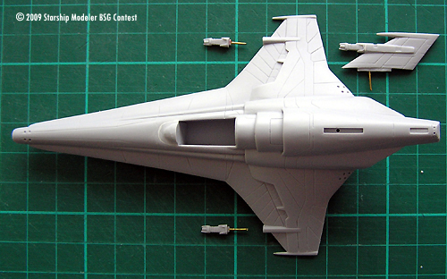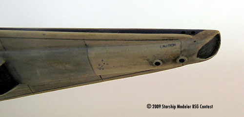 The landing gear bays can be opened, and I originally chose to display the model in a hangar scene on its landing gear as part of a diorama. That means I glued the landing gear on the hangar floor. Its position allows the model to be placed on its gear with the gear pins fitting in the holes in the landing gear bays of the model. Unfortunately I didn't manage to finish the hangar for this contest, so the model can only be seen in flight mode with the support rod that uses one of the thrusters (that way there is no disturbing extra hole in the model and still it can be mounted safely).