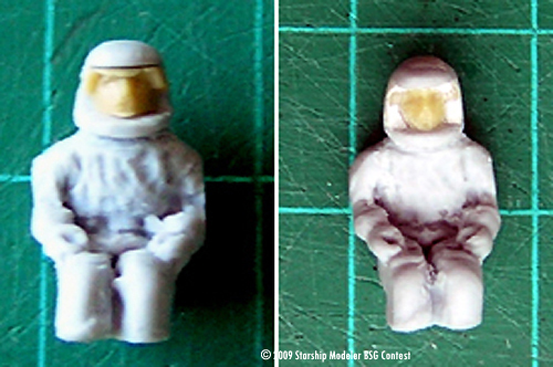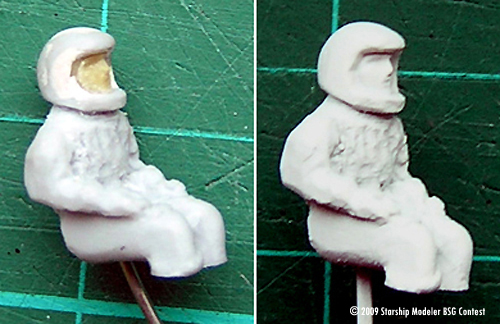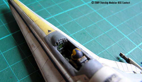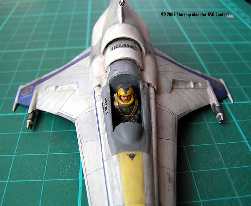 The pilot on the other hand is ugly, so I gave him a face (as I imagine a cockpit with atmosphere support) and a seatbelt to hide some of the badly sculpted overall he is wearing. The rest of his flaws are hidden by the canopy which is nice and clear but due to its curve and the resulting reflections makes it difficult to make out too many details of the inside.
