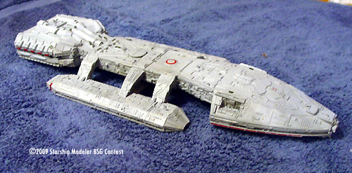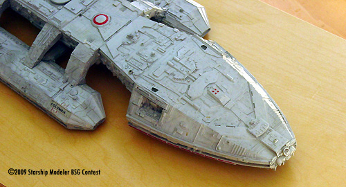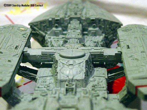 Basically, if a large flat raised area was unadorned then it probably got something added on or near it to supply some visual interest. The head ventral section came in for special treatment to give it a more plated or armored look. Various plastic vents, grilles, and domes were also added. Where some details were damaged they were repaired, replaced with greeblies or plated over with photoetch or plastic sheet. The base color is Testors Acryl Light Grey, while the red highlights are Floquil Coast Guard Red enamel. Various Acryl black washes were used to bring out details. The red circle atop the dorsal dome is from the JT Graphics battlestar decal set as I ruined the Timeslip decal. I didn't paint the red highlights on the front of the landing bays simply because I thought it looked better plain.
