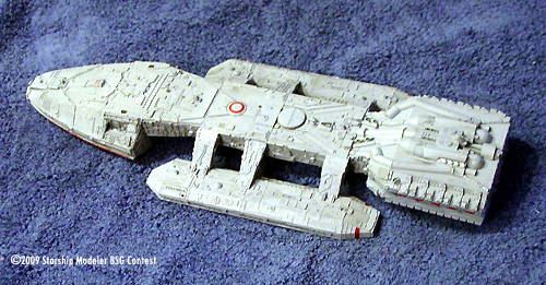 This is the Timeslip Galactica model, made into the Battlestar Columbia. The model went together well. There were a few rough spots, but overall this is the prettiest resin model I've seen, and the casting was quite nice despite being such a detailed subject. The model went together quite easily with no real problems. Slow curing gel superglue was used for joining the major components. Some on the SSM message board commented that a heavier duty adhesive like two part epoxy would be better, but the superglue worked fine - just be sure to throughly coat the contact points and give the parts plenty of time to dry. I gave the major assemblies a day apiece to cure, and there have been absolutely no problems.