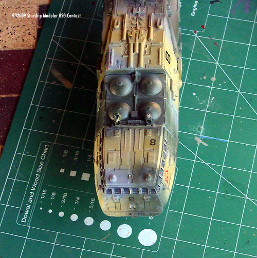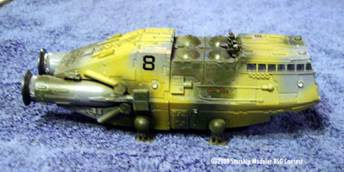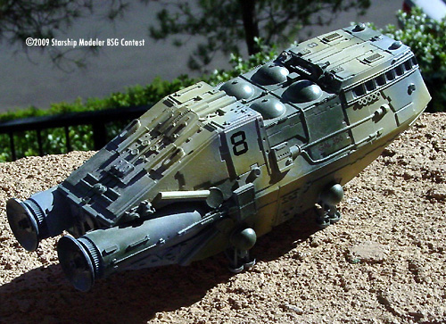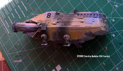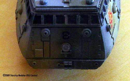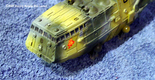 This is the Alliance Original Series Colonial Shuttle, purchased from Federation Models. I wanted to do something different, so she received a nice camouflage scheme, as if she was actually in service as an assault transport. The paints are various shades from the Testors enamel and acrylics line. Weathering was done with a number of light grey washes to really dirty up the previously clean paint job - remember, this is a hard working combat shuttle, not a hangar queen. The boar's head nose art came from a Monogram F-8 Crusader VF-11 decal sheet; I have forgotten where the numbering came from. There are many extra vents and thruster ports added here and there, including vertical thruster ports on the shuttle's ventral side so that the thing could actually take off in real life. I must admit to being bothered by there only being those two big engine bells in the back and nothing else. These are Wave detail parts bought from 'Da Store. The shuttle does not sit perfectly straight, as the landing gear was tough to make consistent lengths all the way around. There is a slight lean to it, I must regrettably admit.