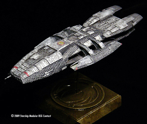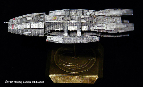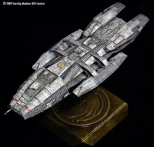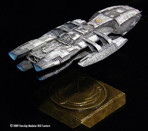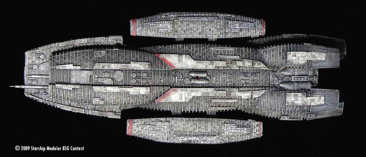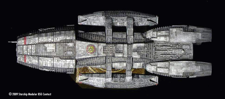 This is a model of the Battlestar Galactica from the Sci-Fi Channel series of the same name. This little gem of a kit is mastered by Coby Lorang and produced by Alliance models. My copy of the kit was purchased from Federation Models. It finishes at 6-3/4" long.