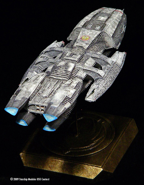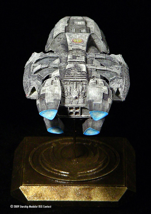 The paint was all done in Artist’s Acrylics - Liquitex and Golden’s applied in thin washes and light dry brushing over an acrylic-lacquer automotive primer. The colors were gesso (white), mars black, raw umber, payne’s gray, with red and yellow for the markings. Coby provided some beautiful scribing for the Galactica’s flight pod hull markings, so rather than use the kit decals, I painted those by hand. The base was finished in dark bronze, bright brass, and raw umber.