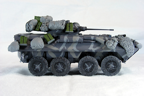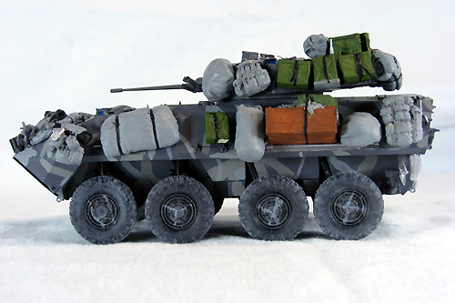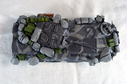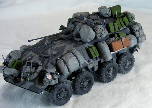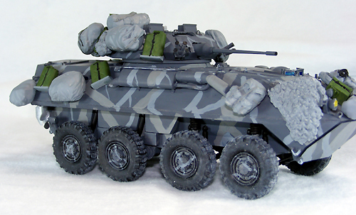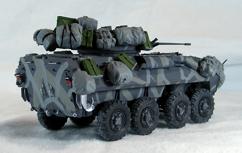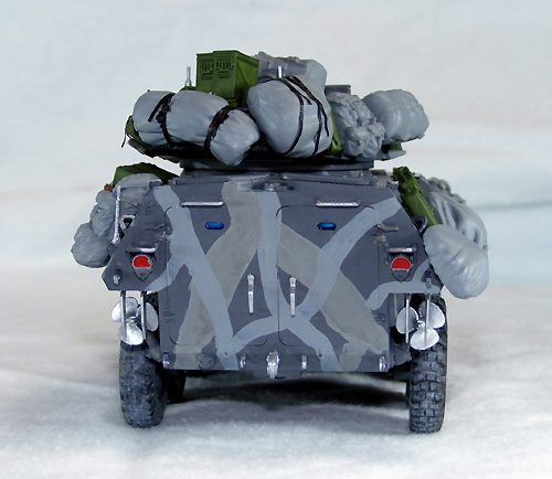 The Urban Camouflage scheme was hand painted using Acrylics. Gunship Grey is the hull base color with Dark Ghost Grey and Neutral Grey accents. The tires were weathered using a combination of three pastel chalk pencils. The stowage parts were hand painted with acrylics also.