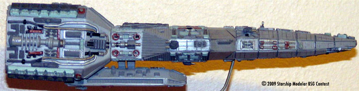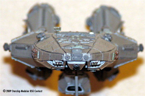 On the engine housings, I added some detail pieces from 1/700 scale warships. I forget what they were originally supposed to be, but thought that would make good antennas - either for communciations or as sensors. I put two on each of the outboard surfaces. I also added some small detail pieces that appear on the Original Series Battlestar Galactica, just below and somewhat behind the name plate. I thought that these would give it a better sense of scale, as I want it to be the same size as the Revell-Monogram and Timeslip Creations model kits.