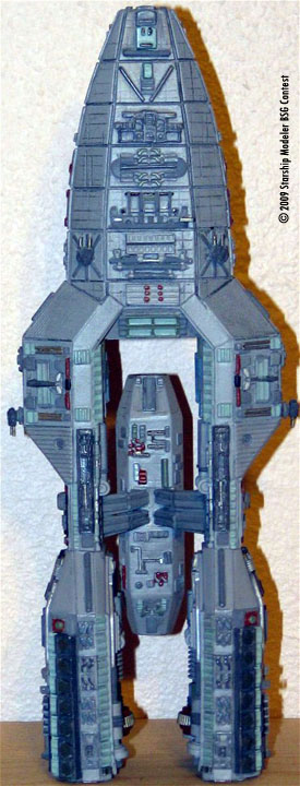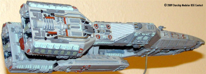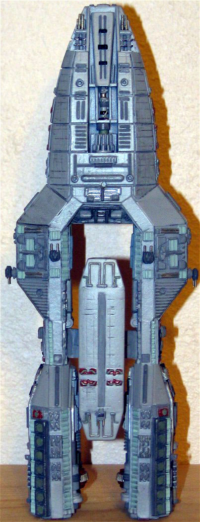 This is Fantastic Plastic Defender-class ship in 1/3700 scale. It's based off of a fan-produced design by Todd Boyce, made initially for a table-top Role-Playing Game (RPG) in which he played fairly regularly. One of the fine folks at Zoic Studios, being fans of TOS BSG and ship design, saw this design online while trying to come up with "fill ships" with which to flesh out the Rag Tag Fugitive Fleet for the new Battlestar Galactica, built a CGI model and added it. We initially see the design in the first episode of Season One, entitled "33" - albiet from an aft view where we really can't make out much detail. We later see it appear in some long shots, most notably next to the U.S.S. Sulaco from the movie "Aliens" in the First Season episode "Flesh and Bone". It shows up most prominently in the last episode of Season Two, "Lay Down Your Burdens, Part Two", shown over New Caprica as the RTF jumps away from the Cylon Fleet that just appeared overhead.