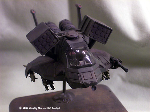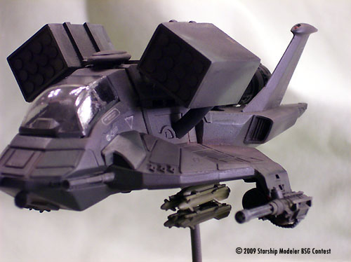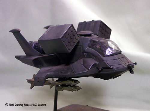 The kit used is the Black Suns 1/72 Raptor (great kit by the way!) built mostly out of the box with added scratch built features. These include the two multiple missile launchers, the mini gun and ammo drum. The smaller missiles come from a 1/72 apache kit and the larger missile is from the 1/72 weapons set. There are no pilots right now as I have seemed to have lost them somewhere. The interior was painted and weather even though it is barely visible through the cockpit. Colors used for the camo are flat black as a primer, light coat of helo drab and then a motlling of marine green. It really gives the Raptor that menacing look.