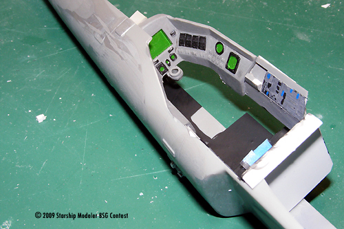 The canopy forward piece is from the kit original and I added a scratchbuilt back section. This was detailed using Chartpack line tape.