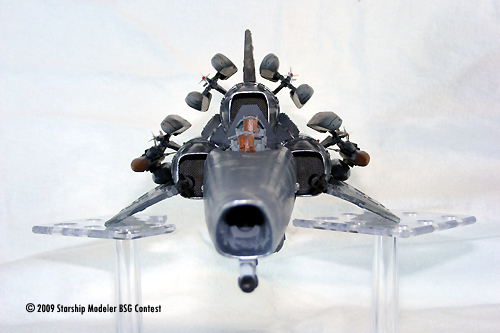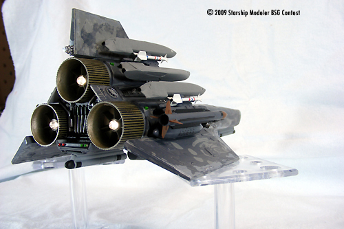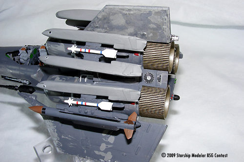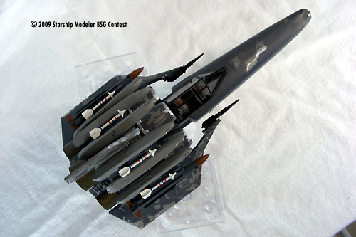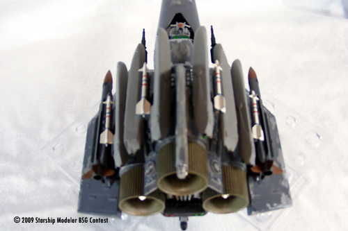 The nacelle mounted weapons are a mixed bag, all mounted on 1/72 pylons from a F/A- 18. The Shark missiles are 1/72 scale Tomahawks from the Revell B-2 Stealth Bomber (the giant boomerang-shaped one). The Gnats are 1/72 Sidewinders, and the Dragonflies are 1/48 scale HARM missiles.