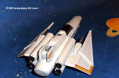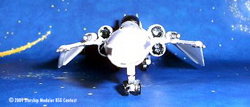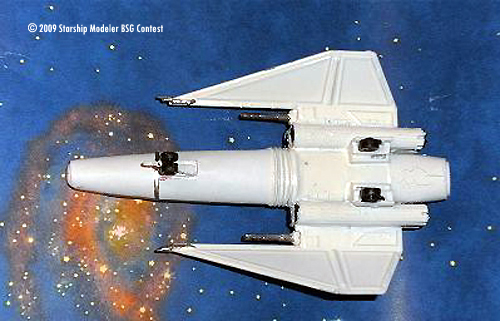 The model was made from various items collected along the way, purely because of their “spaceship” potential. These include a highlighter, felt pen caps, and undercarriage from a plane model. Other parts of other models found their way into my gubbins box, and were used for the tail fins, blaster cannons and the wings (yes, there are from a small snap-fit Tie Fighter). Card and putty were used to fill out recesses and gaps. The scale is in the region of 1:72.