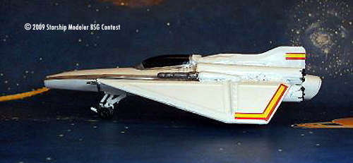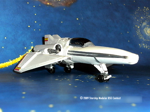 The Mark V Viper is a similar size to those originally on board the Galactica, but are faster, more manoeuvrable and have greater fire-power, with two banks of weapons, standard pulse lasers on the wing-tips, and laser “blaster cannons” (mounted closer to the body), for a heavy punch against Cylon Basestars and other capital ships, where accuracy is less important than force.