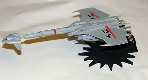 When I was in high school I thought this was the coolest ship ever- except for maybe the DY-100. Even though it was only on screen for a few seconds it left a lasting impression. When I had some time, ambition, and three Airfix 1/72 F-15s all at the same time, I started cutting and pasting. The ventral intakes are two sectioned F-15 intakes and adjacent bodywork spliced together with putty and scrap plastic. The fuselage is mainly the third F-15, upside down, with the neck lengthened with an old rocket half that matched the F-15 taper and part of a cheap plastic corkscrew. I was fresh out of Saturn V engines, so cobbled some together from beads, 1/200 SSMEs, the nosecone of one of the F-15s and other spare parts. The wings are built from plastic sheet and based on a 3-view of the Buck Rogers Starfighter I found on the web. The command pod/lifeboat/whatever it is was a real stumbling block for me. It looked so darn familiar, but after several attemps it still did not look right. Then I looked at the the Roomba's remote control. I chopped off the end, added a few bombs and drop tanks and there you are.