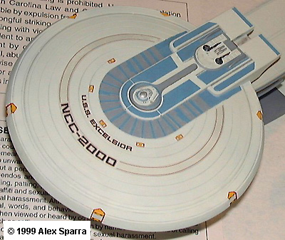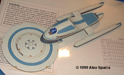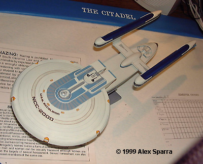 This is my USS Excelsior made by AMT/ERTL. It was a nice kit my only complaint was that it was too small. Most everything fit together nicely, however the bussard housings on each warp nacelle required a little tweaking to make them fit. The nacelles themselves attached to the pylons easily but I had to work to get them straight. Decals were slim. Anything not red was painted. I airbrushed the entire model "Model Master" ducks egg blue. The warp nacelles and the deflector dish were Tamiya clear blue, the deflector array housing was spray painted chrome silver, which made it very shiny but it looks great! I hand painted the "Aztec" pattern on the saucer section. For that I used Poly-scale big sky blue and some generic medium gray. I also used chrome yellow and insignia red in a few places on the saucer. I am most proud of the blue areas on the underside of the secondary hull. These areas I masked off and airbrushed, there was a chance that it wasn't going to turn well out but it did and I'm very happy with my results! |