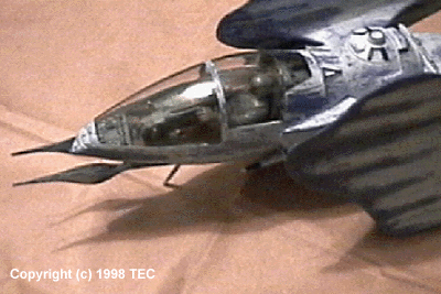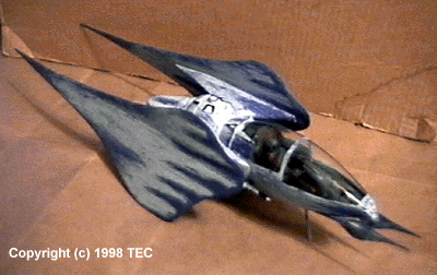 This model is of a Human-Minbari hybrid fighter designed for the InterStellar Alliance from Babylon 5. Class name: Tigershark. I scratchbuilt it mainly from: SeaQuest Stinger, and parts from: USS Wisconsin, TIE Interceptor, USS Enterprise D model stands, a Cylon Raider, unknown aircraft model and sheet styrene |