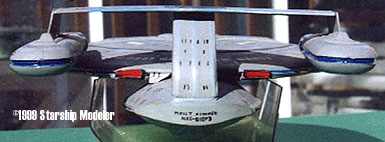 In early 2375, she took part in the stand at Bolarus IX, the battle that established the Bolian Front. Facing a primarily Cardassian force, Molly Pitcher led the charge to break through the ranks of the enemy line. As she maneuvered between the 2 rows of Cardassian vessels, taking hit after hit, she and the other 4 ships in the charge released hundreds of self-replicating mines of the type used to blockade the Bajoran wormhole through their cargo doors. The minefields immediately cloaked and the Cardassian forces surrendered upon notification of terms by the allied commander. For her gallantry in action, the entire ship's complement was awarded the Christopher Pike Medal of Honor. For another image of the ship, click the link below: |